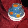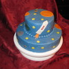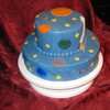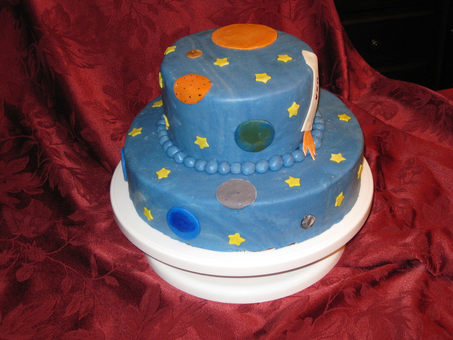 Outer space cake for my son's 4th birthday. Devil's food cake, chocolate mousse and chocolate ganache. Covered in MMF and MMF accents.