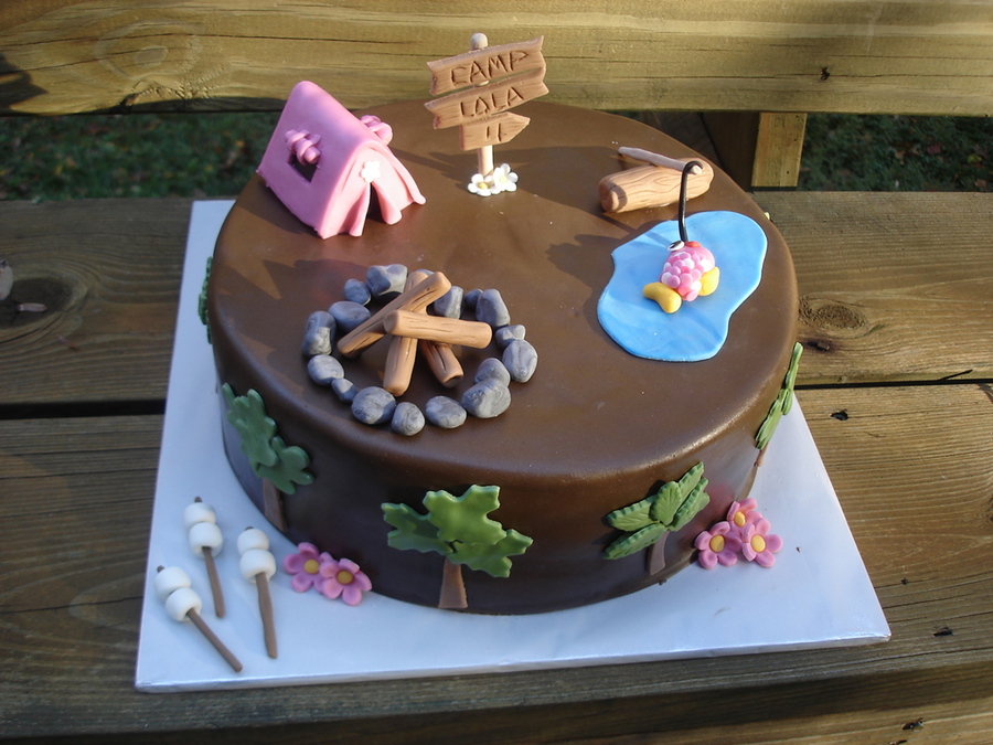 This cake goes with the camping cupcakes. Cake is chocolate chip pound cake with chocolate ganache filling.