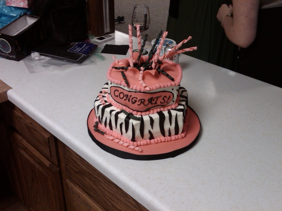This was for a friend who graduated from college. Her party was pink and black and her personality is crazy so I went with a little zebra print and the cake bursting with confetti. The cake is a WASC cake with strawberry swirled into it. The filling was strawberry cream. Covered in BC with fondant accents.