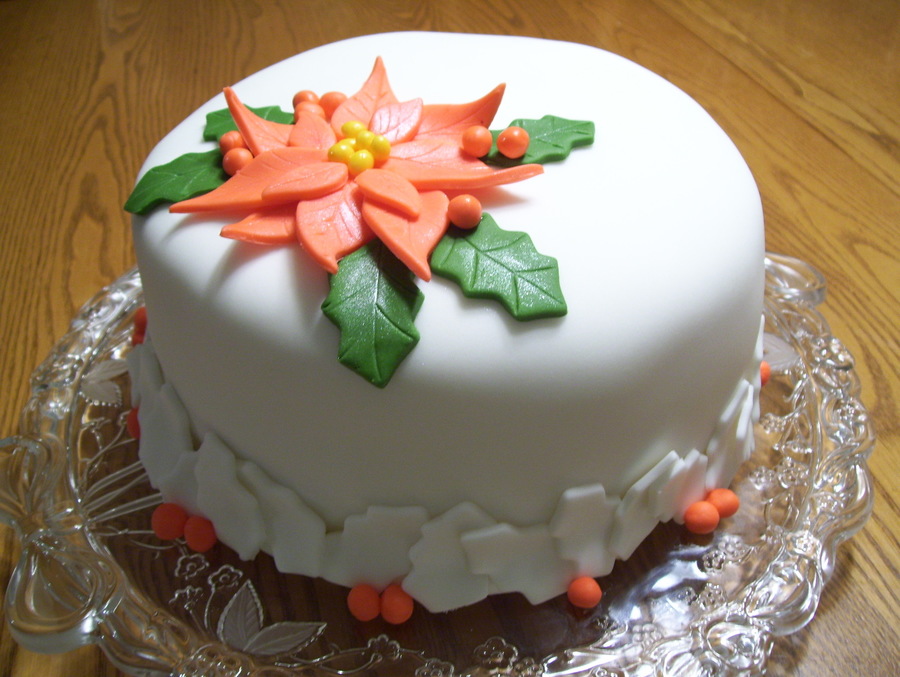 Fondant covered cake. I used a leaf shaped cookie cutter for the poinsettia leaves. I used a holly leaf cookie cutter for the border.