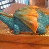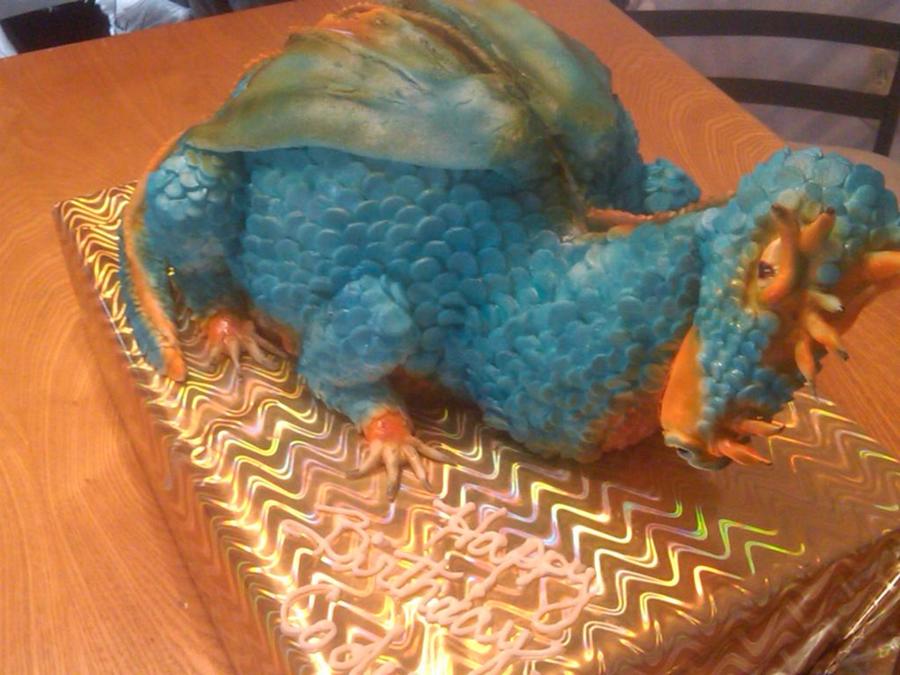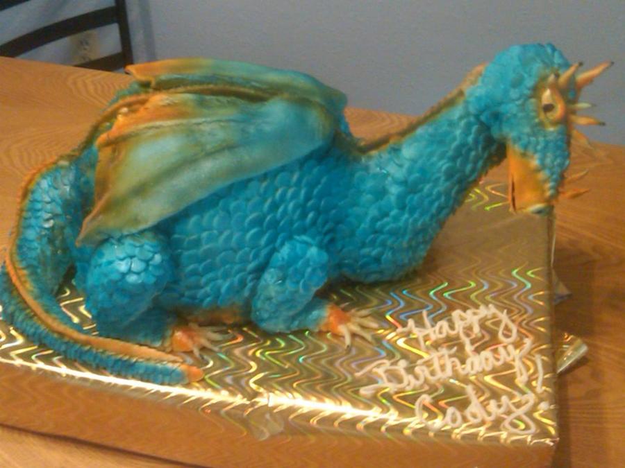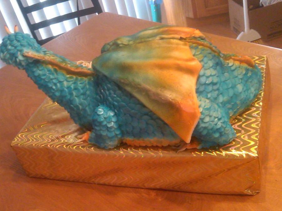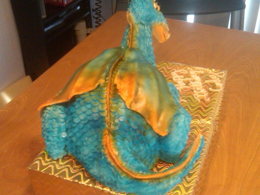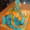 My co worked asked me to make a dragon cake for her son, she wanted it blue and orange... this is what I came up with... the dtragon in white cake with bc and cream filling... the overlay is mmf and the scales and most of the details are mmf, the legs are rice crispy treats as is the head and covered in white chocolate modelling clay and the whole thing is airbrushed in food coloring and detailed in food coloring...