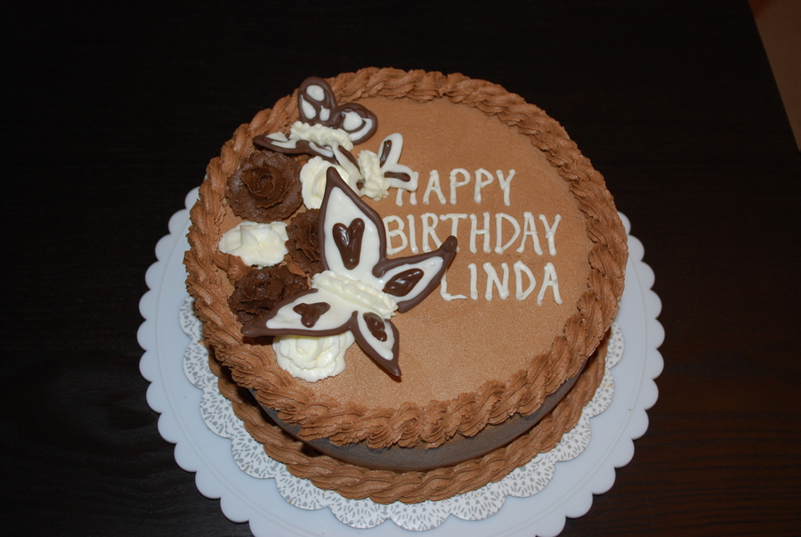 This cake is double chocolate with raspberry filling iced in chocolate buttercream. Roses are dark and white chocolate buttercream. The butterflies are chocolate and almond bark that I melted and "drew" on wax paper and then I peeled them off and attached them to the cake with white buttercream icing.