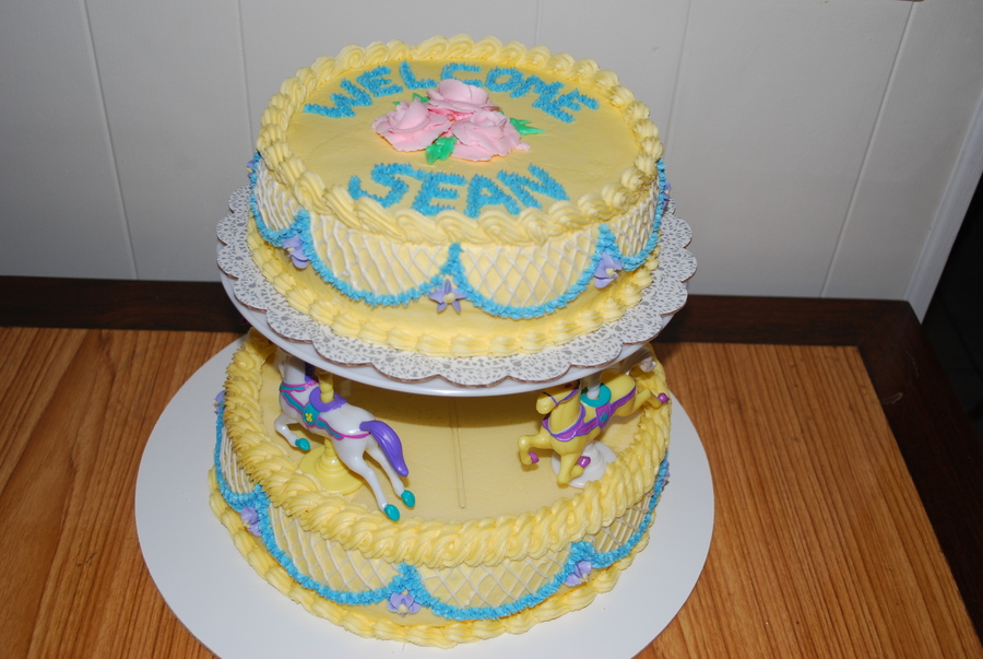I made this cake using a Wilton Carousel Horse seperator set. Top cake is a 10 inch lemon cake with lemon curd filling and iced in buttercream and the bottom cake is a 12 inch double chocolate.