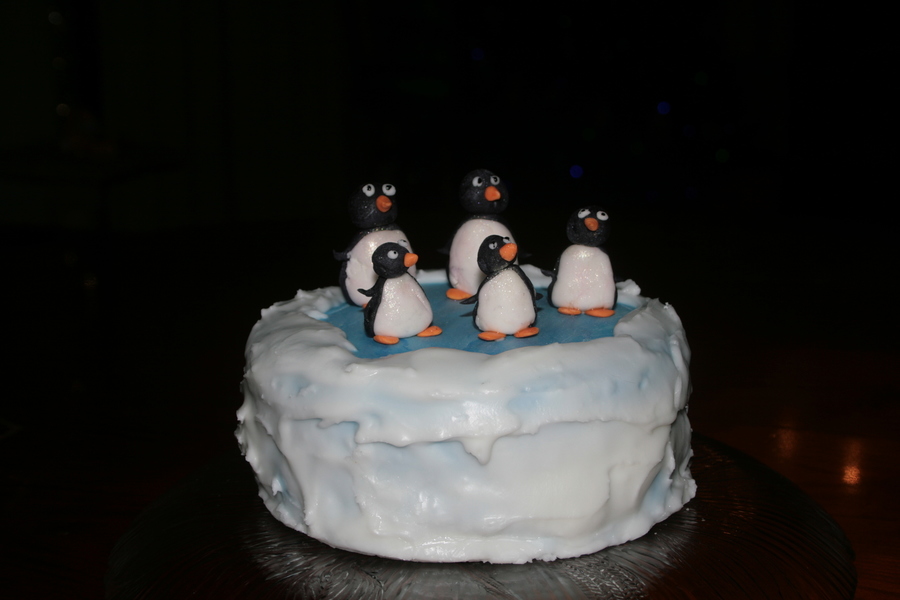 Yellow sponge cake with whipped chocolate ganache filling. Coated in poured ganache and then in MMF. Snow is powder sugar glaze. Penguins are all MMF (my second attempt at making 3-D figures).