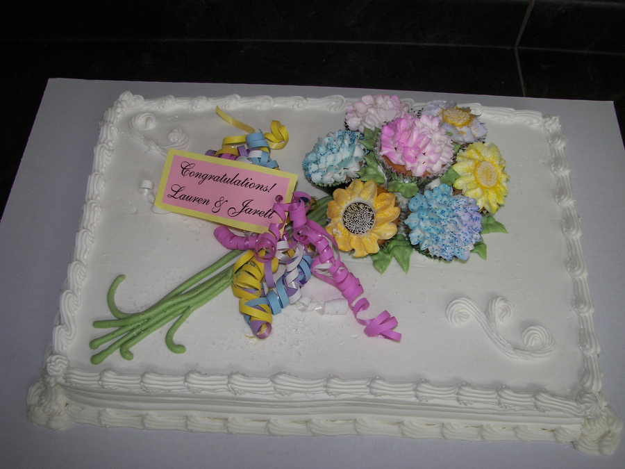 What more fitting for a Bridal Shower that a "Bride's Bouquet". Fancy flower cupcakes top this sheet cake, accented with ribbon to match shower decor.