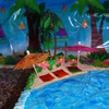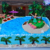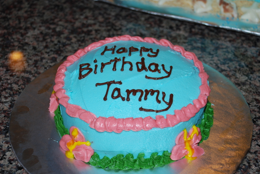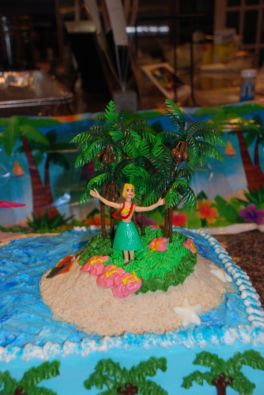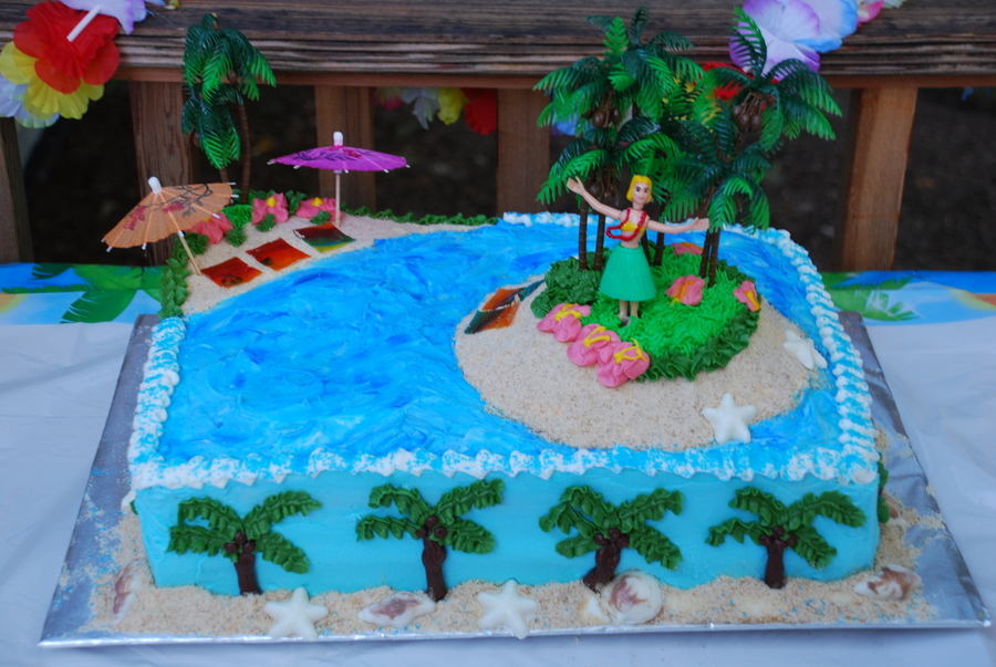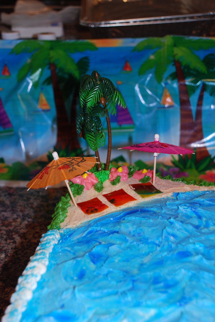 I made this cake for our end of summer "Island Party". I used crushed Nilla Wafers for sand, blue sparkle gel for the ocean, white chocolate/chocolate shells, and fruit roll up for the beach towels. Trees and hula girl are plastic. I also made a small cake for a guests' birthday with similar theme and flowers. Thanks for looking.
