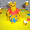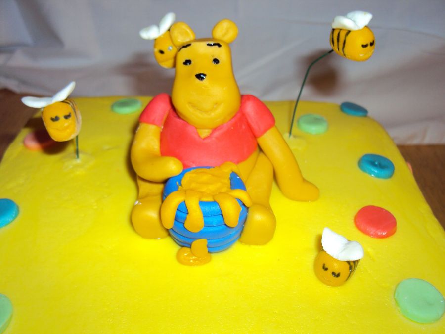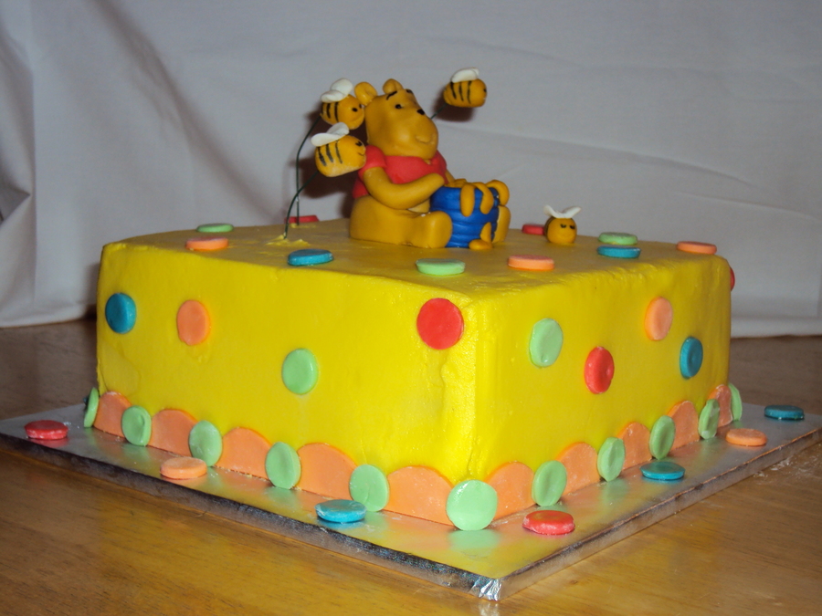 This was a cake that I mad for a friend at work. It was a two layer white cake with butter cream icing. All the accents and Winnie were made from fondant.