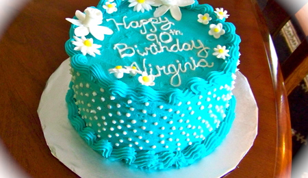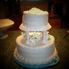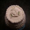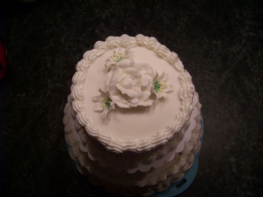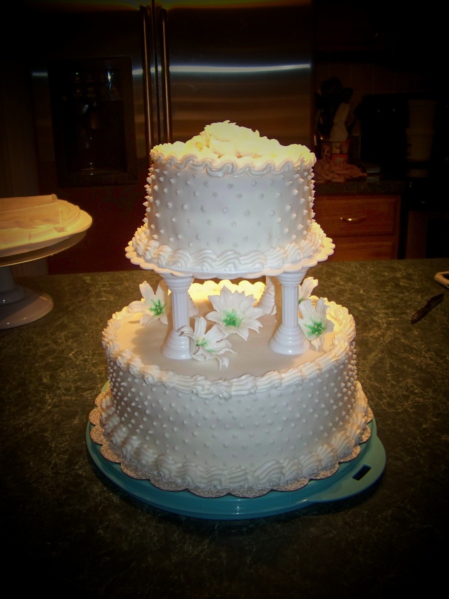 2, 10 inch round cakes on bottom, 2, 6 inch cakes above. Made with fondant, buttercream icing for accents, and royal icing Lilly's.