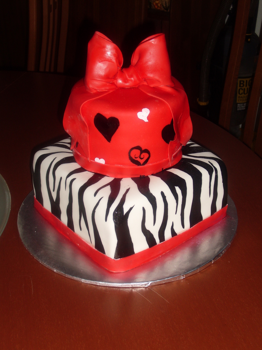 covered in mmf with gumpaste bow. the hearts and zebra stripes are painted on using food gel color and vodka