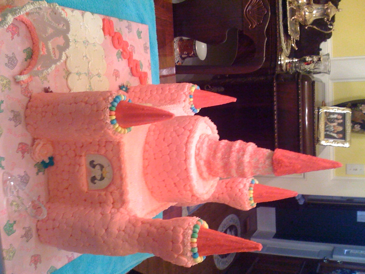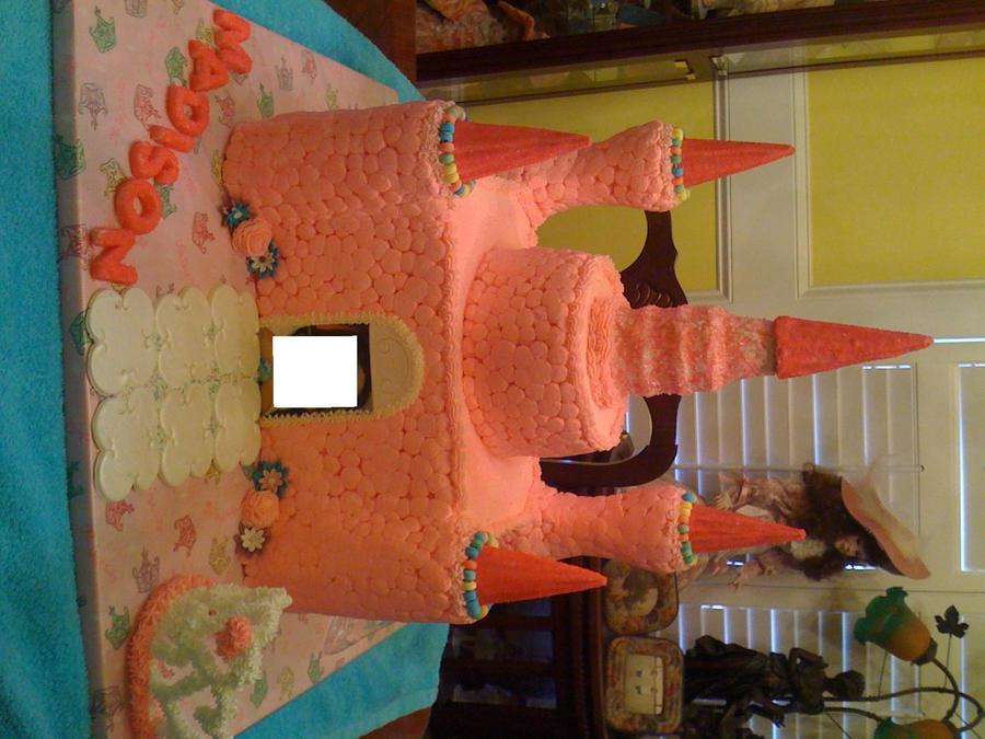 castle is butter-cream icing - turrets are ice cream cones -walkway and door/windows are mmf and tiara is royal icing