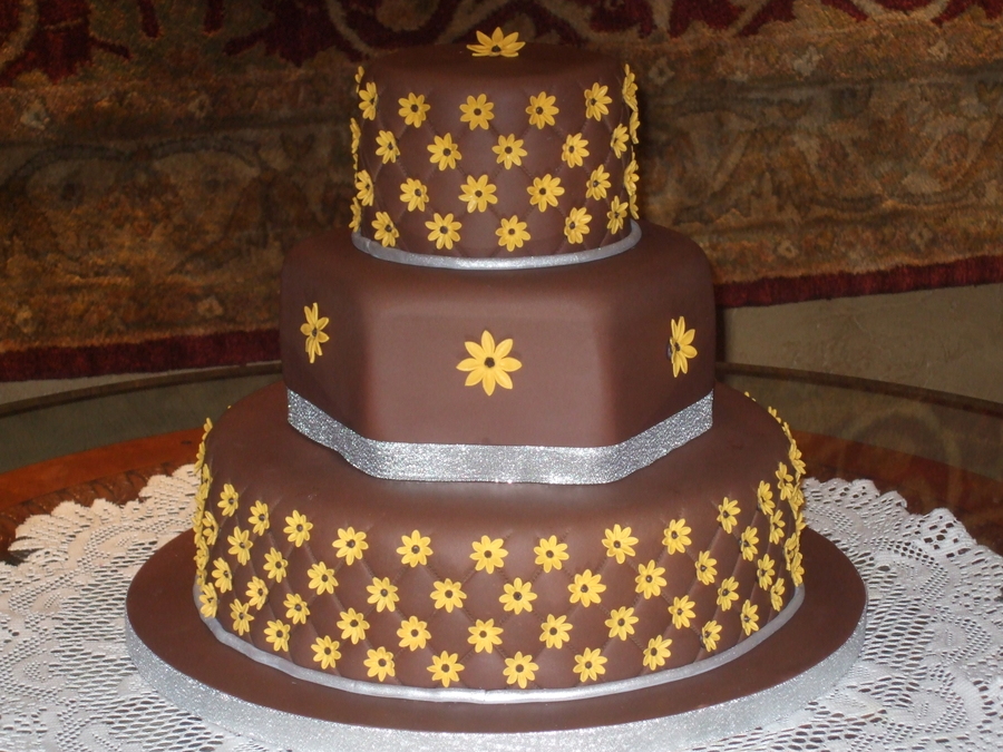 What a fun cake to make for an adorable bride! Thanks to 2muchsugar for help with the chocolate fondant. Daisies were made with Jennifer Dontz's Pearl Clay. Bride absolutely loved it!