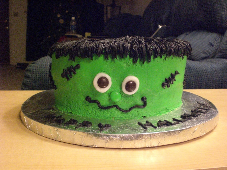 My boss asked me to make this cake for her grandson's class at school. Since he is in kindergarden, I wanted a Halloween cake that wouldn't be too spooky. I thought this was a good compromise, because he still looks a little goofy :) Everything is BC except his eyes and nose, which are m&ms. The good thing about making this cake is that you only have to use 3 of the m&ms and still have the rest of the pack ton enjoy for yourself. :)