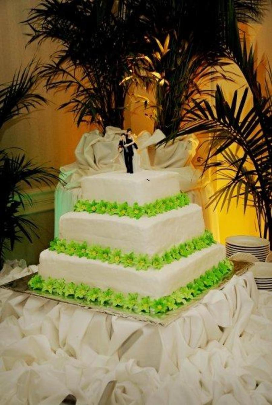 This was my very first wedding cake :) I hope to make many more. I used 8", 12", and 16" square cakes. All are iced with BC. The flowers are made of royal icing. I used directions for making an easter lilly, but made them green instead of white to fit the wedding's color theme. This cake was actually for my brother and law, who is a big football fan.....therefore the goofy cake topper. I was kind of hoping all of my hard work on those flowers (it was my first time using royal icing) would be topped with something more elegant. :) But I guess the football topper matched his personality better. :)
