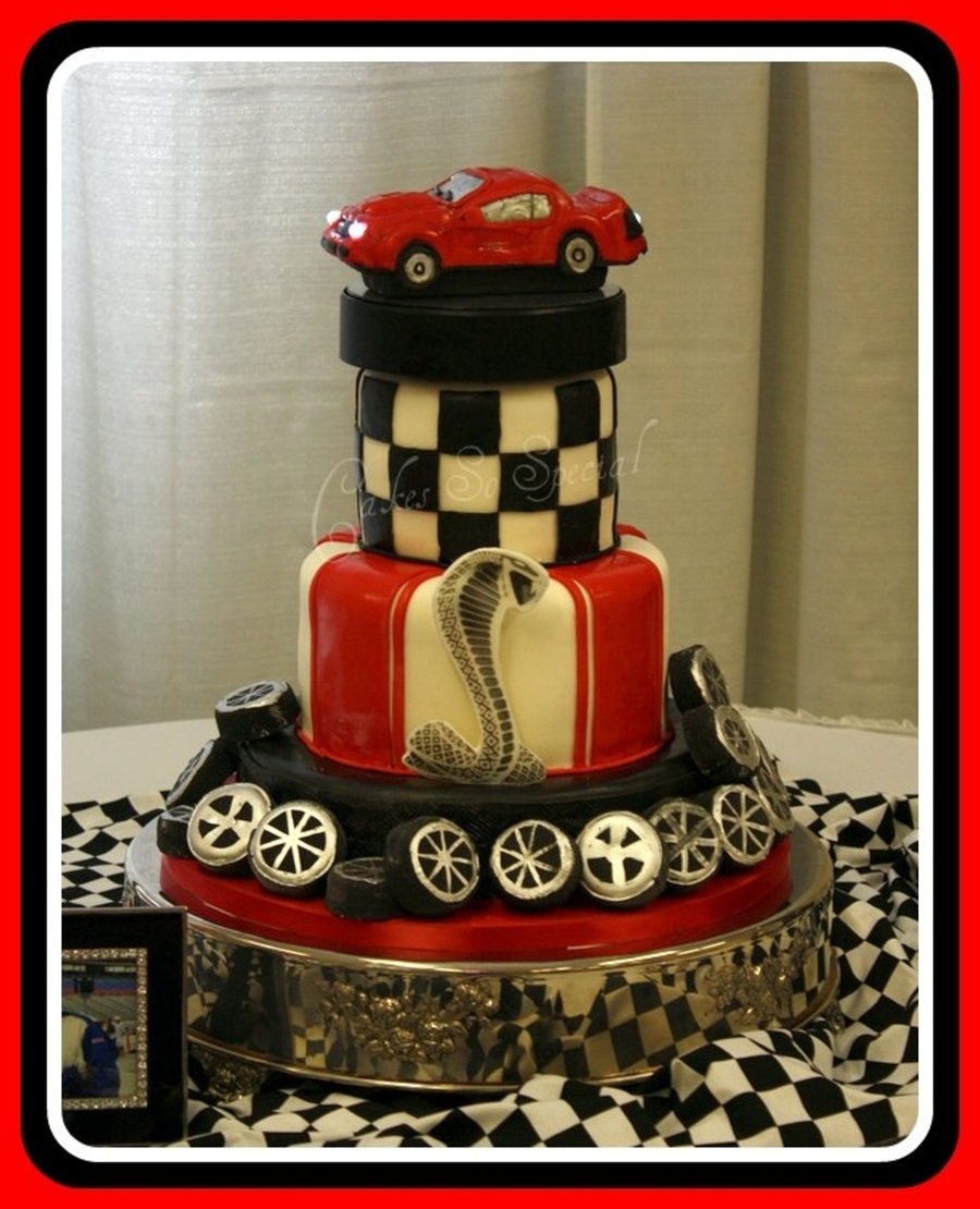 RKT Red Cobra with working lights on a spinning platform sat on a 6" chocolate cake stacked on a 9" cake and 12" single layer. The 12" cake had "tread" and was circled by little oreo cookies molded in chocolate ( NEVER AGAIN) covered in fondant, wrapped with "tread" and painted with silver. The cake sat on a silver plateau and was a hit. I went back to pick up equipment and took the little car off and set it aside. This little boy at the wedding stood there and just stared at it...I think he wanted to play with it!