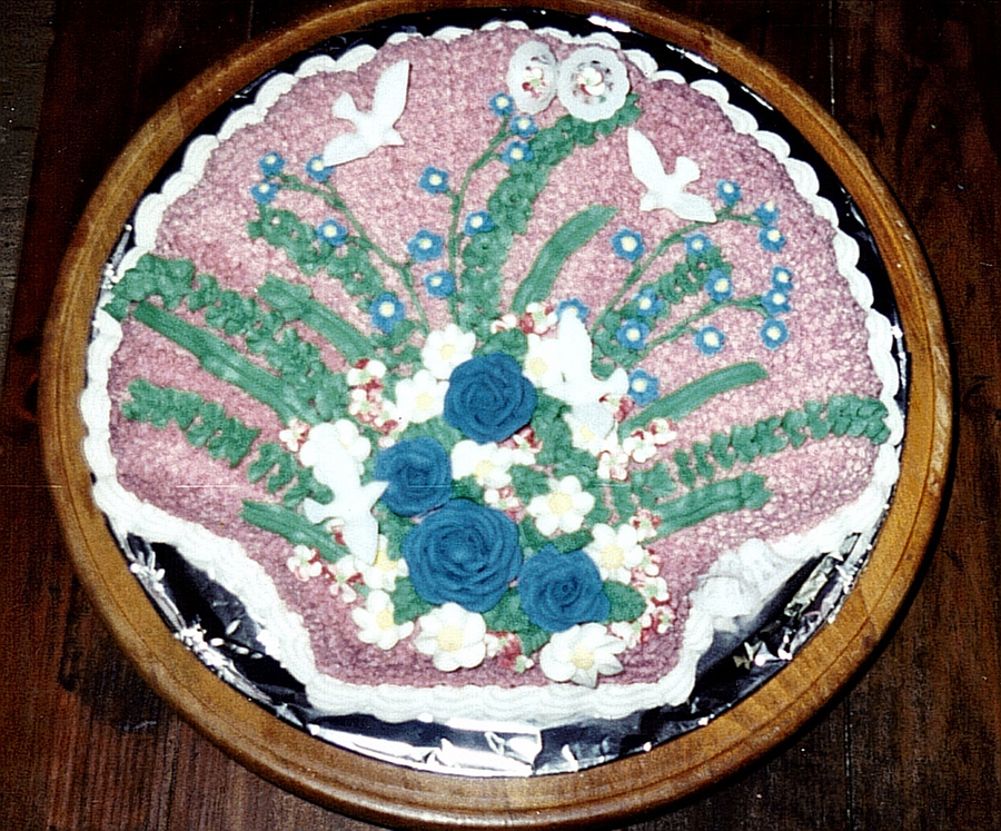 I did this for practice. Yellow cake, Buttercream icing, Royal flowers. Plastic Doves and Bells. I like to practice when I can. And my Husband and 2 teenage Sons loves when I practice. They ate it all. Thanks for looking.