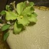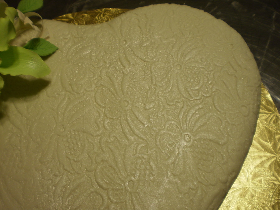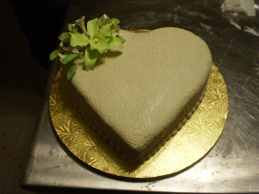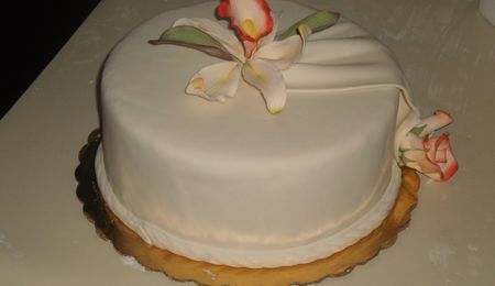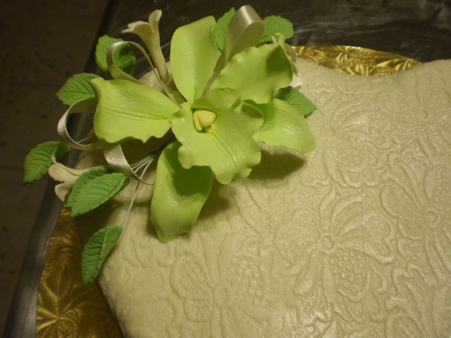 este bizcocho fue hecho de pistachio y el cliente lo pidio q fuera sencillo y delicado, se trabajo la pasta laminada con un diseño floral y con un ramo de orquideas, flores favoritas de la esposa de mi cliente, quedaron tan complacidos q ya me ordenaron un cake para un b-day yessss