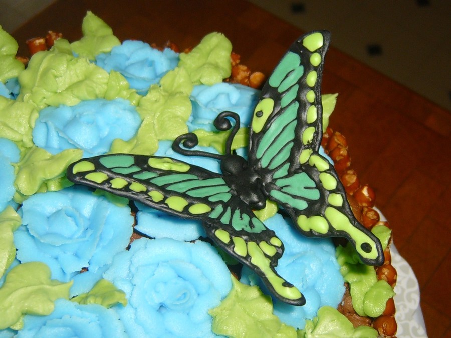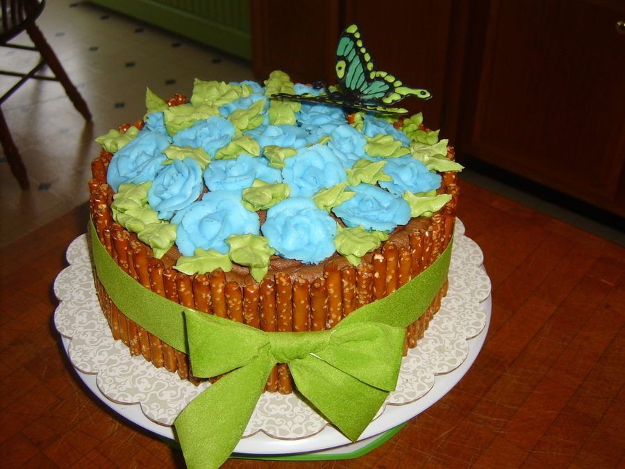 I'm new to cake decorating. I took one Wilton course in November, but I'm definetly hooked. Chocolate cake with buttercream, pretzels and my first color flow butterfly.