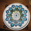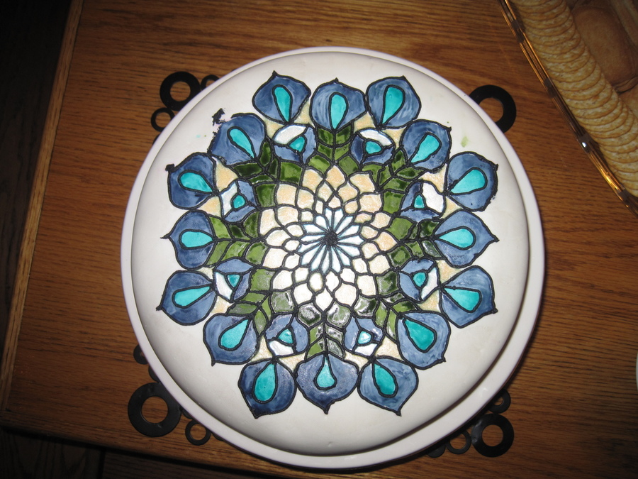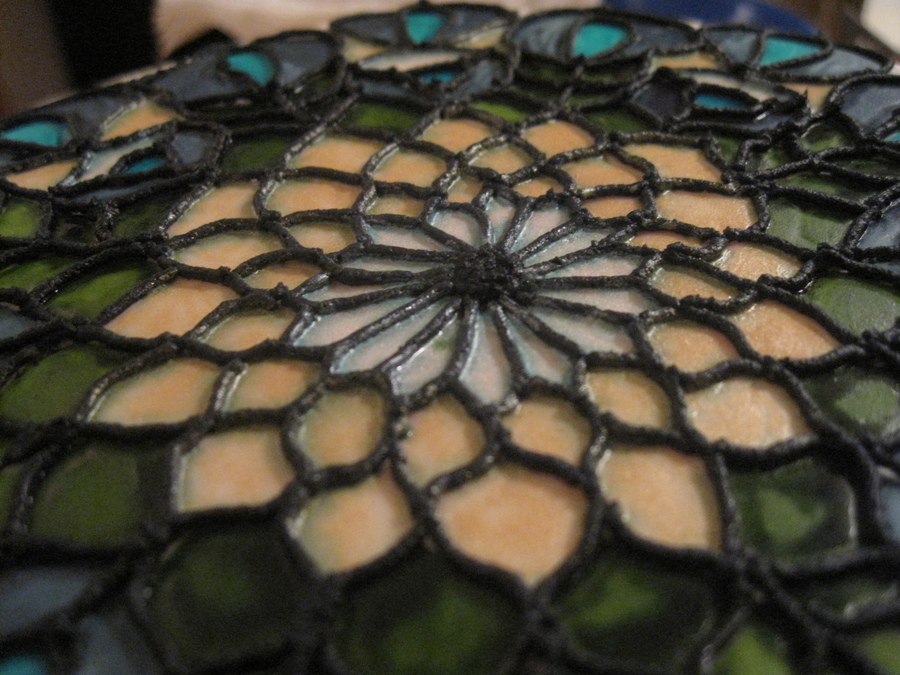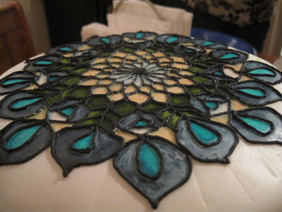 This cake was for my parent's 30th wedding anniversary. I wanted to do a stained glass look and took the design from a piece of glass designed to look like peacock feathers since my mom had peacock feathers in her wedding bouquet.