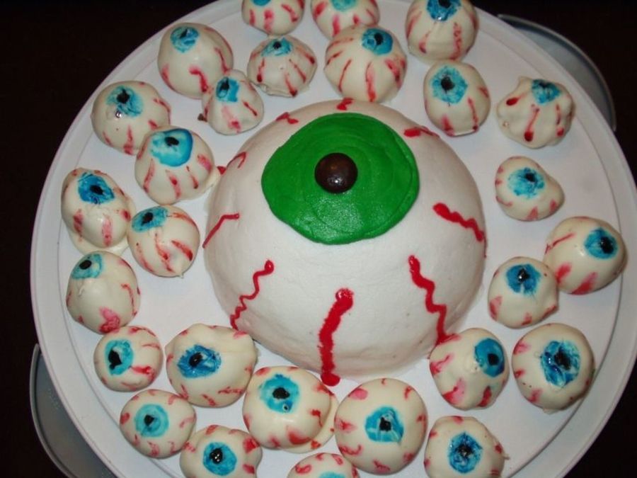 Cake balls are fudge marble cake. Painted with thinned down pastes. Big eye is chocolate cake and buttercream. Junior mint pupil.