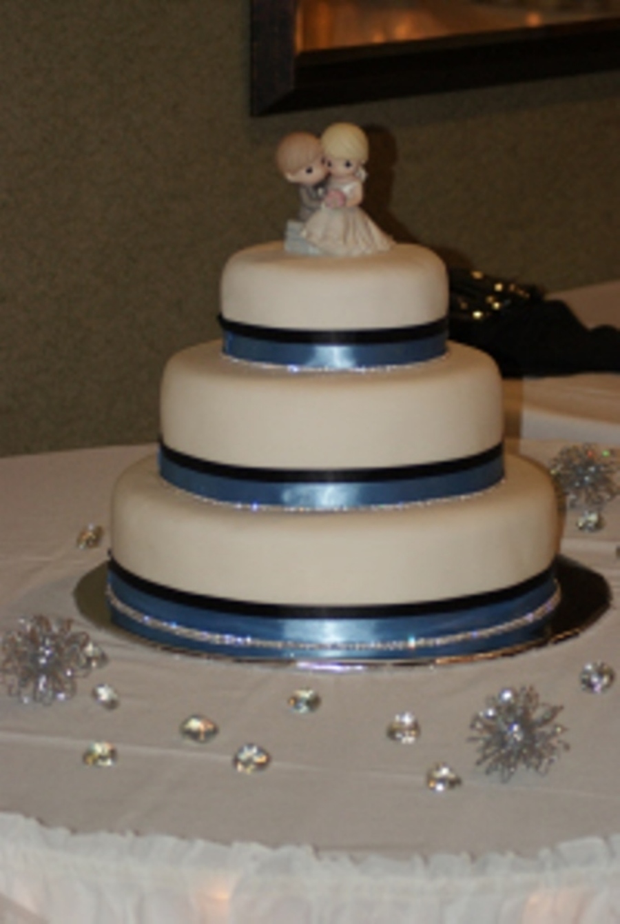 I made this cake for my daughter's friend. I used fondant with black and blue ribbon. I then added a row of crystals.