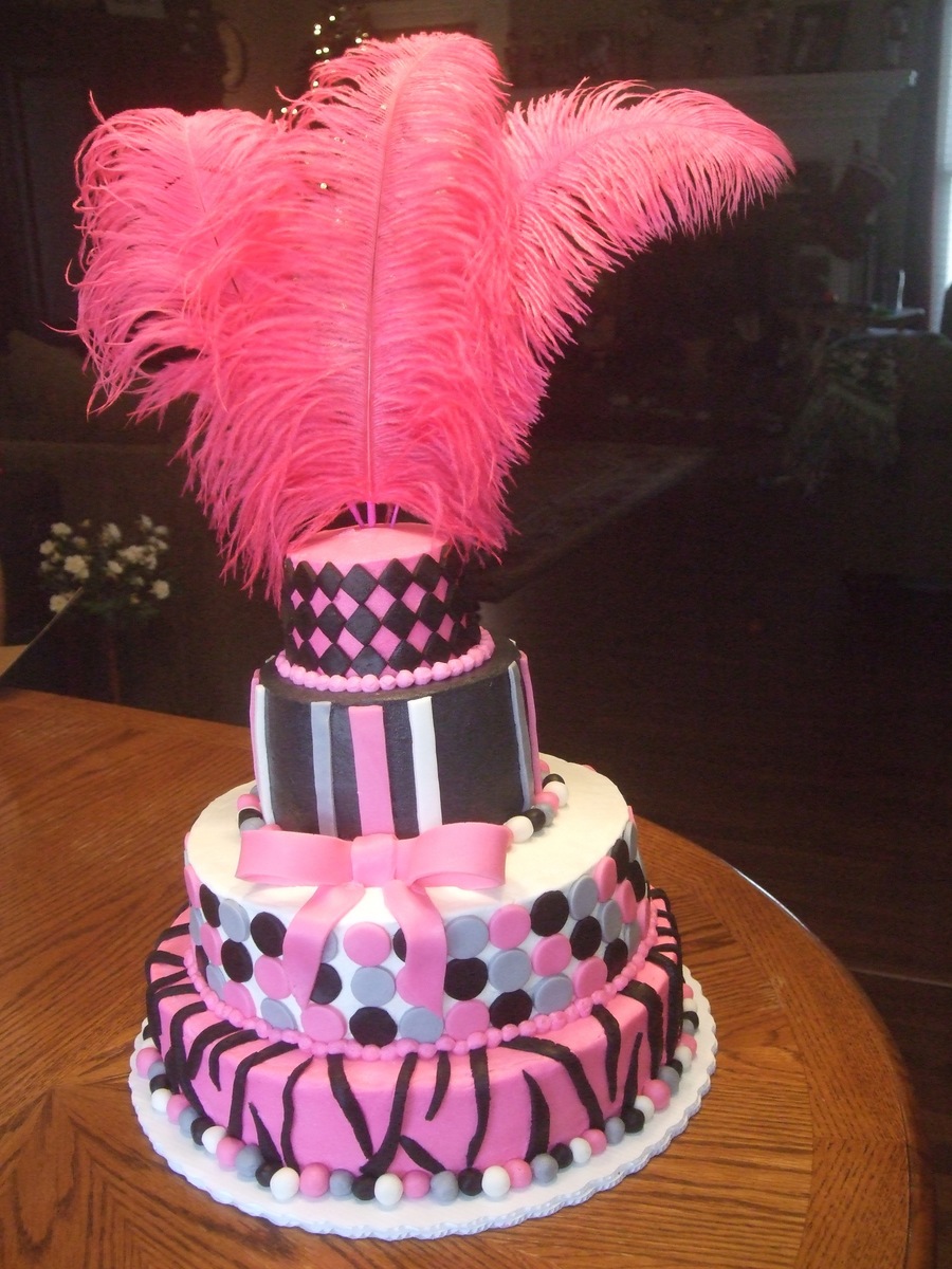 Hot pink, black, silver, & white. Buttercream w/fondant accents- dots, diamonds, zebra stripes, & ribbon