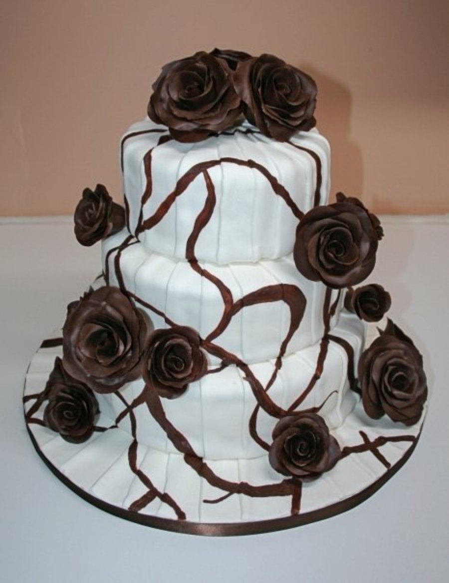 Pleated fondant, and chocolate roses. Some chocolate detail painted on as well.