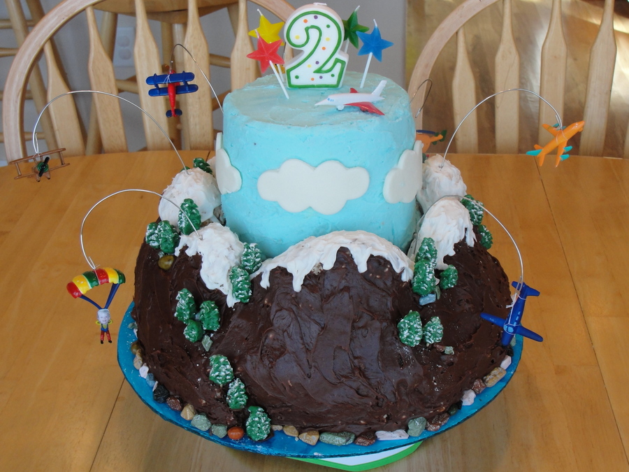 This was for my son's 2nd birthday. I used Rice Krispies for the mountains and then stacked a 3 layer 6 inch round cake in the middle of the mountains. My original plan was to cover it all in fondant, but I haven't quite mastered that technique yet, so I used regular frosting instead.