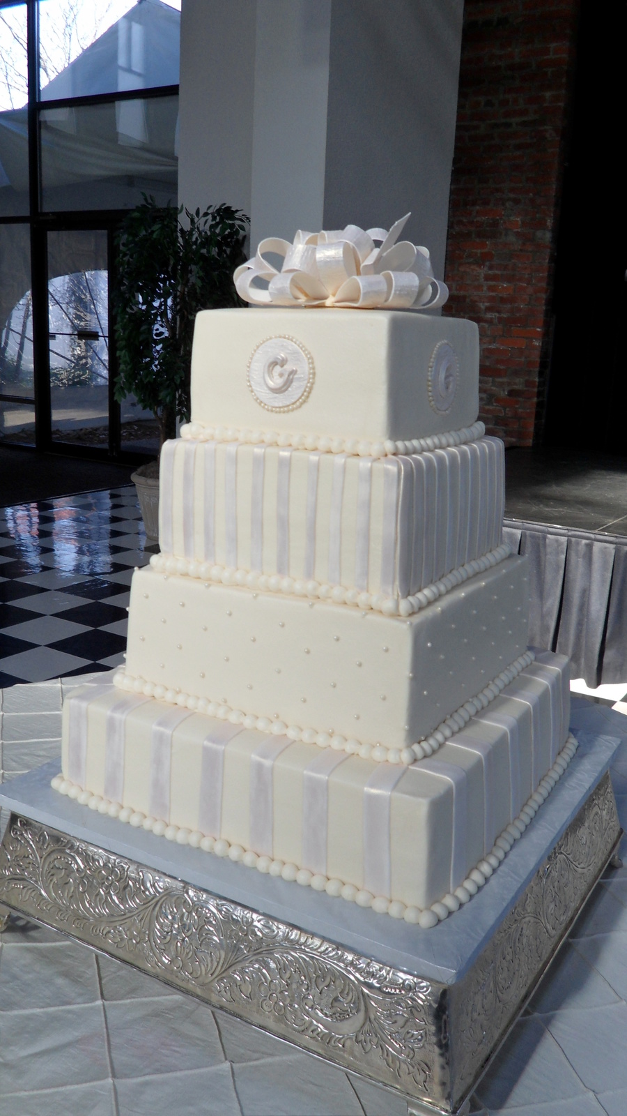 Each of the 4 tiers is iced in buttercream with fondant luster dusted accents. The wedding couples initial adorns all 4 sides of the top tier and a fondant/gum paste bow tops it off!