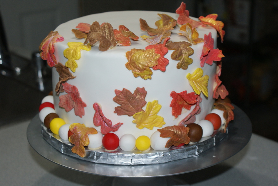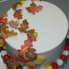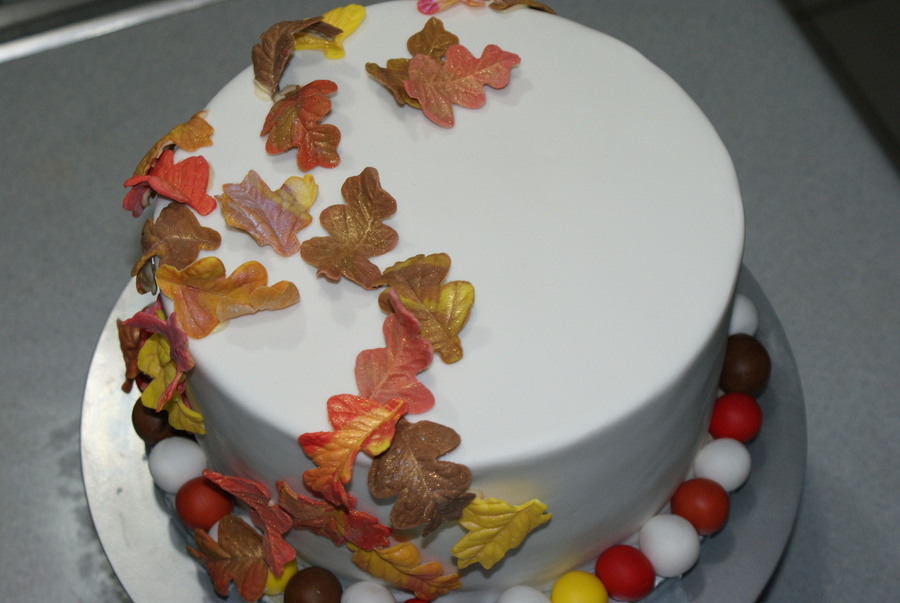 vanilla and chocolate pound cake w/ espresso cream filling, covered in ganache and fondant, all leaves and balls are fondant.