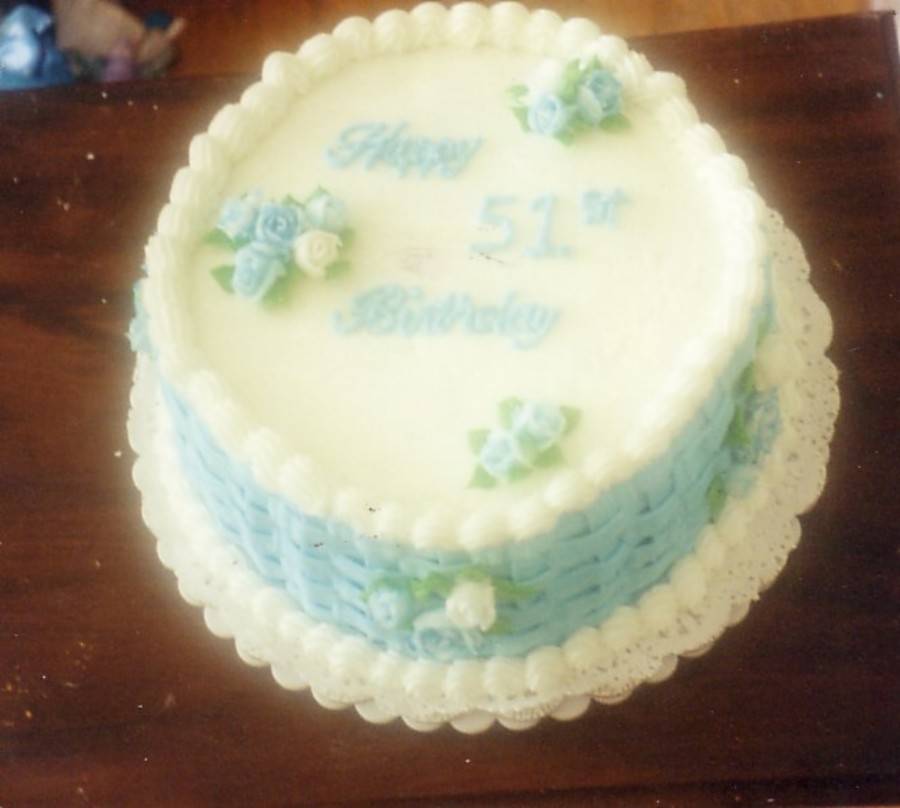 51 st anniversary cake with hand made roses and basket weave on the side of the cake