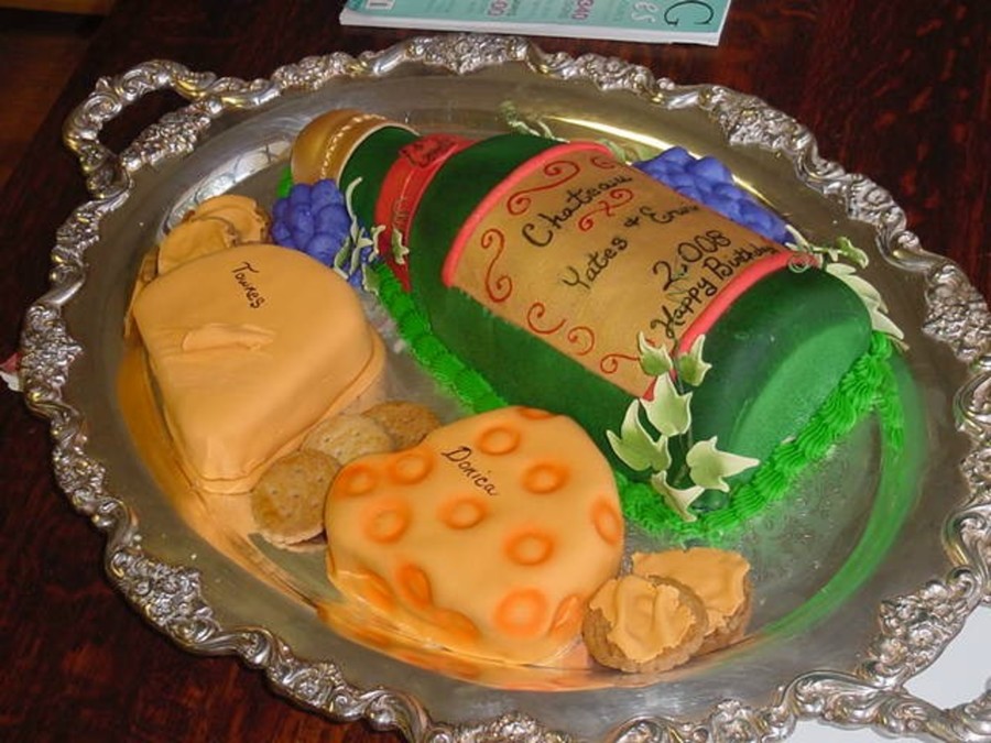 Bottle and cheese are cake covered with fondant, the bottles is acceted with gumpast leaves. The crackers are cookies