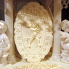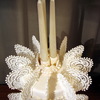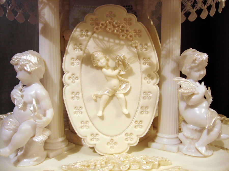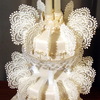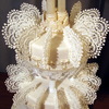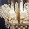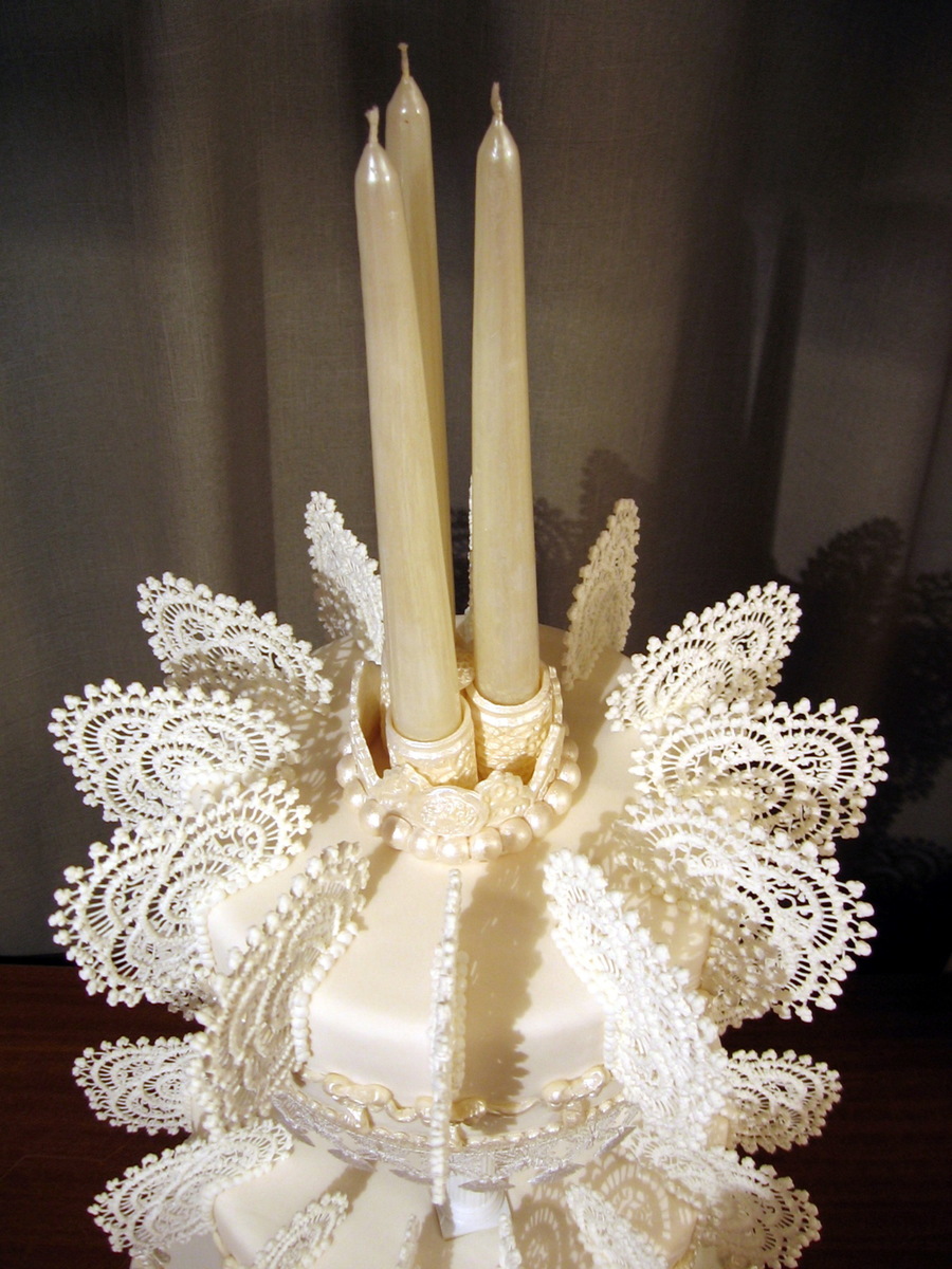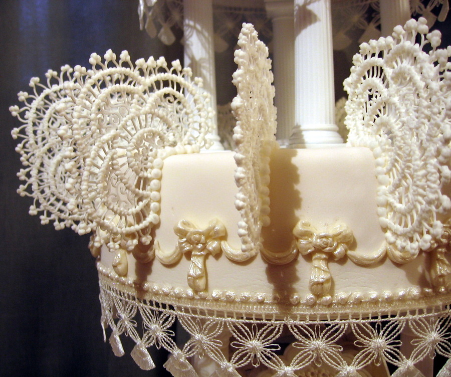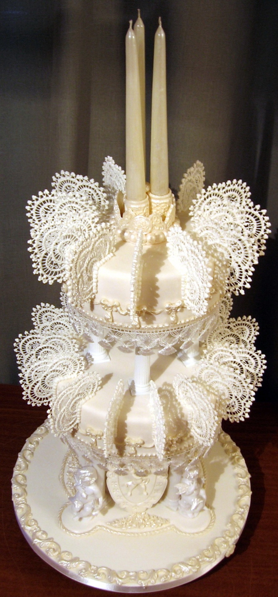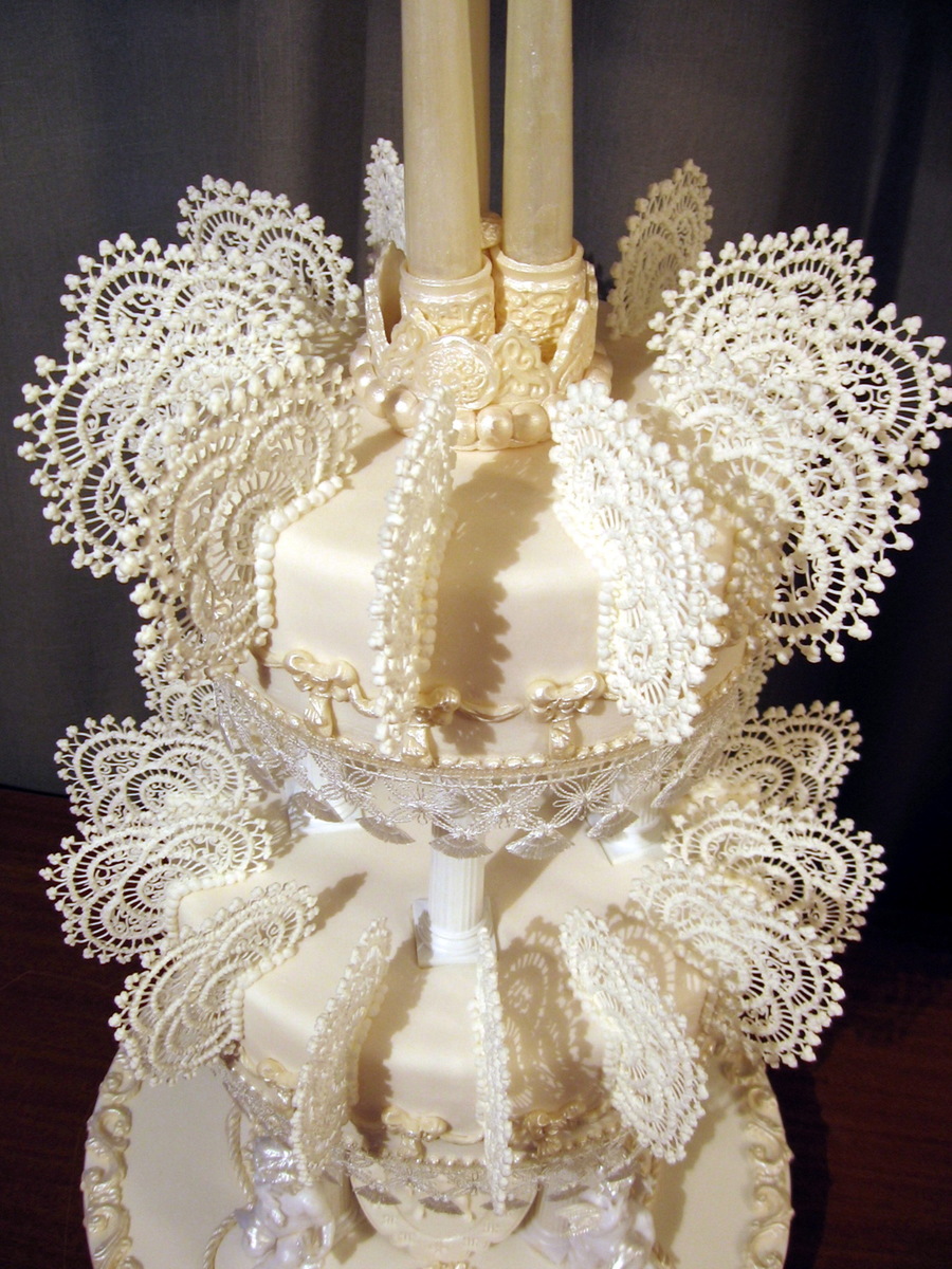 Cake is covered with rolled fondant. Lace is made of royal icing.