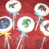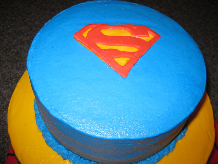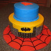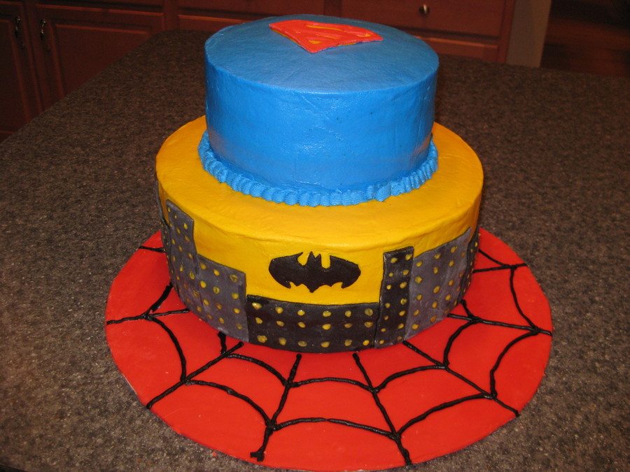 Superhero cake - Superman, Batman and Spiderman. WASC with vanilla mousse, buttercream frosting and fondant accents. Inspired by the many wonderful cakes on CC. Edible image sugar cookies favors to compliment the cake.