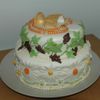 Red velvet and italian cream cake, both filled with creamcheese icing and covered with MMF. I made the cup and cross with pastillaje and all accents are MMF too. I used PME plunger cutters for flowers and leaves.