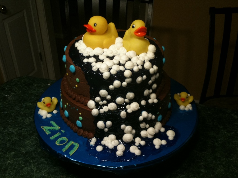 This is a two tier cake with real toy ducks. It is covered in chocolate bc. The bubbles are piped bc. The water is made with colored piping gel. The cake is chocolate chip pound cake.