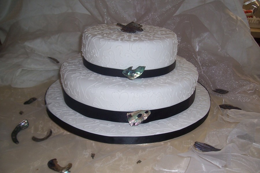 Chocolate mud cake iced in choc ganache then with fondant, with paua shells for decoration.