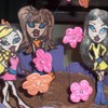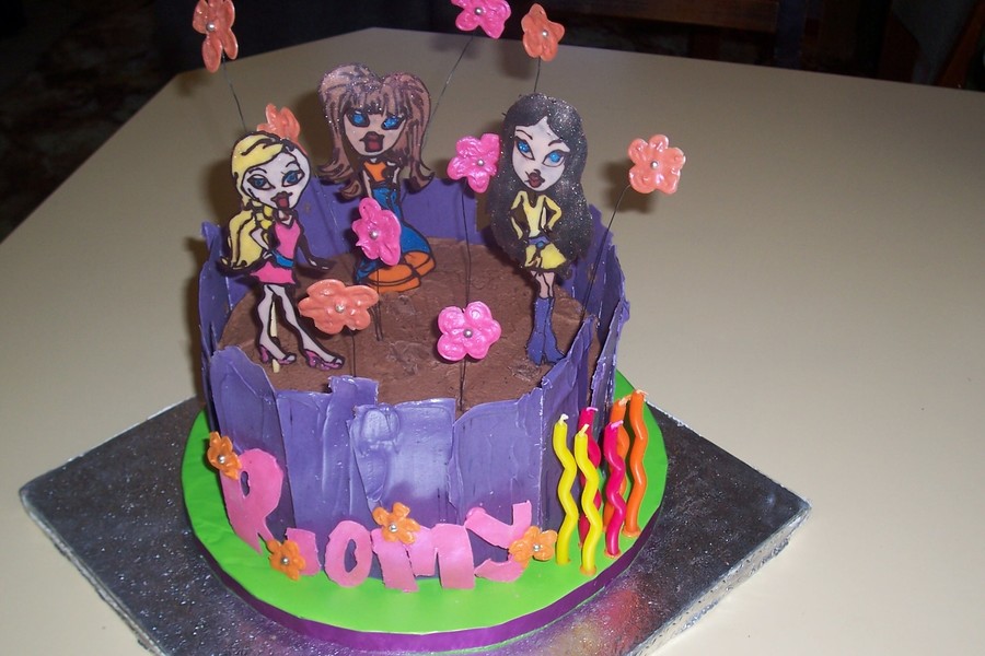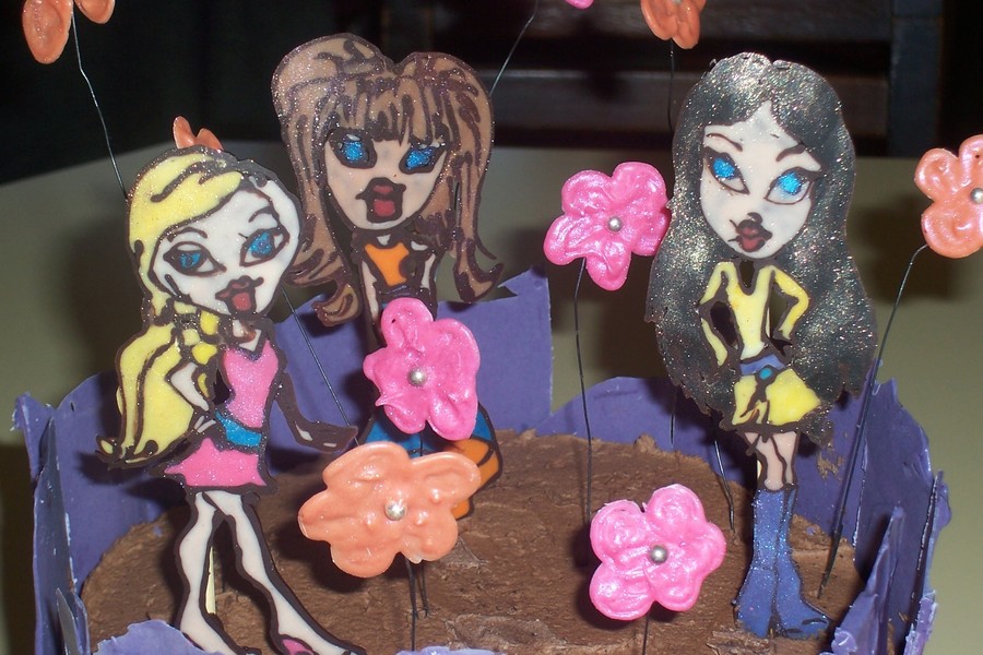 Banana cakes iced with chocolate ganache, choc panels and choc bratz.