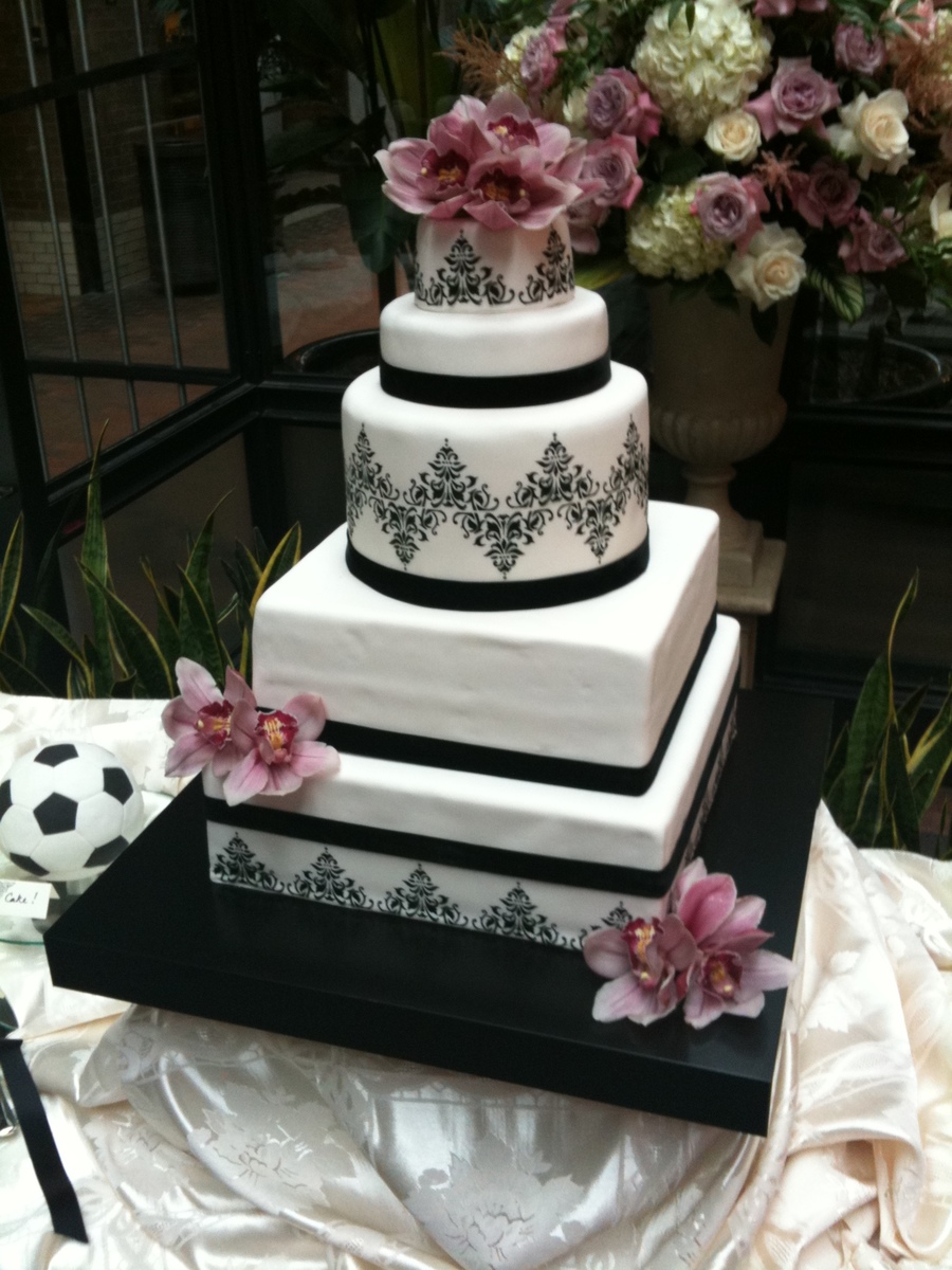 For 250 people, airbrushed design. I demo'd the technique at the West Island Cake Club - I am sure there is a much easier way (smearing royal icing across the stencil then pulling the stencil away) but I was too afraid to do that with black on white! The flowers are real, not gumpaste.
