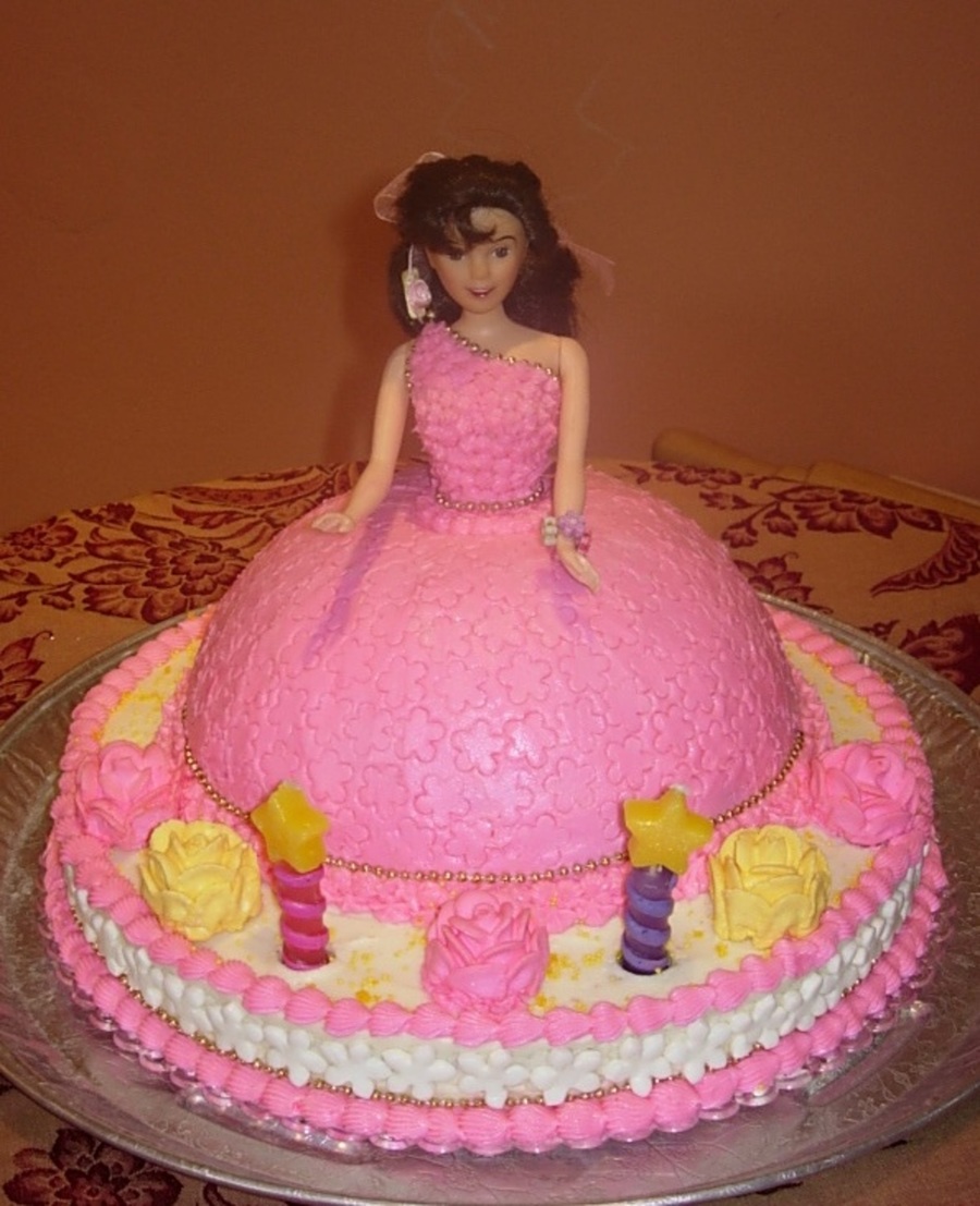 ball pan used for shape of dress, covered buttercream, MMF flowers around base
