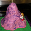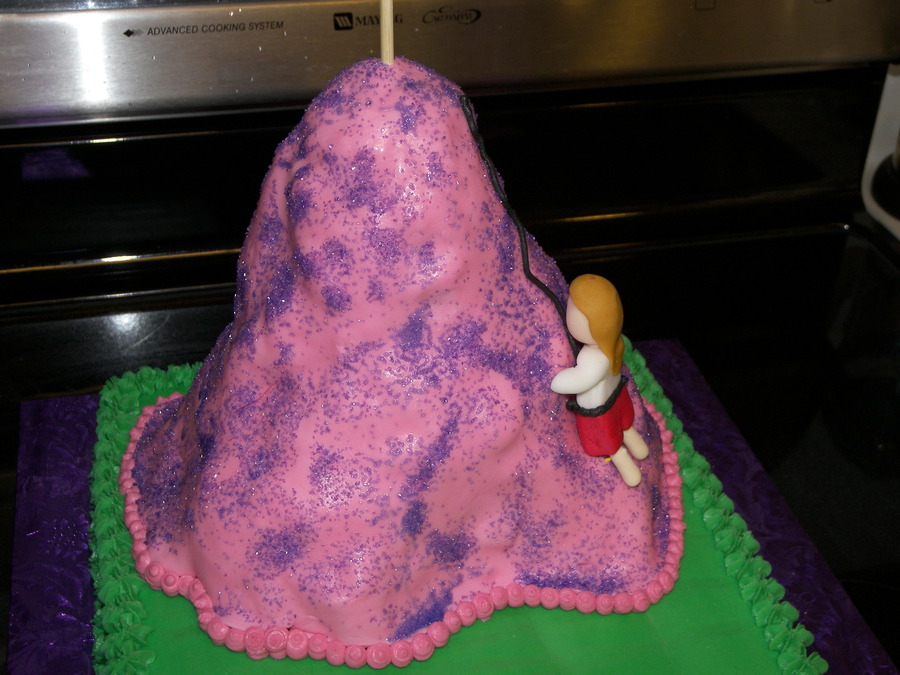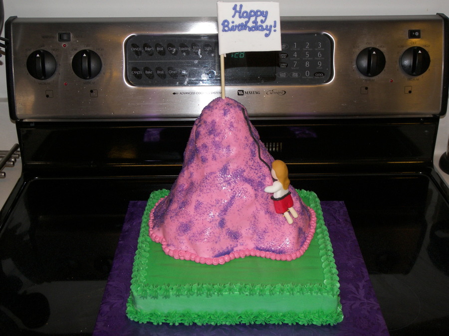 Mountain made out of rice crispy treats and covered with fondant and sprinkles. Sitting on a basic 10" cake covered in buttercream icing.