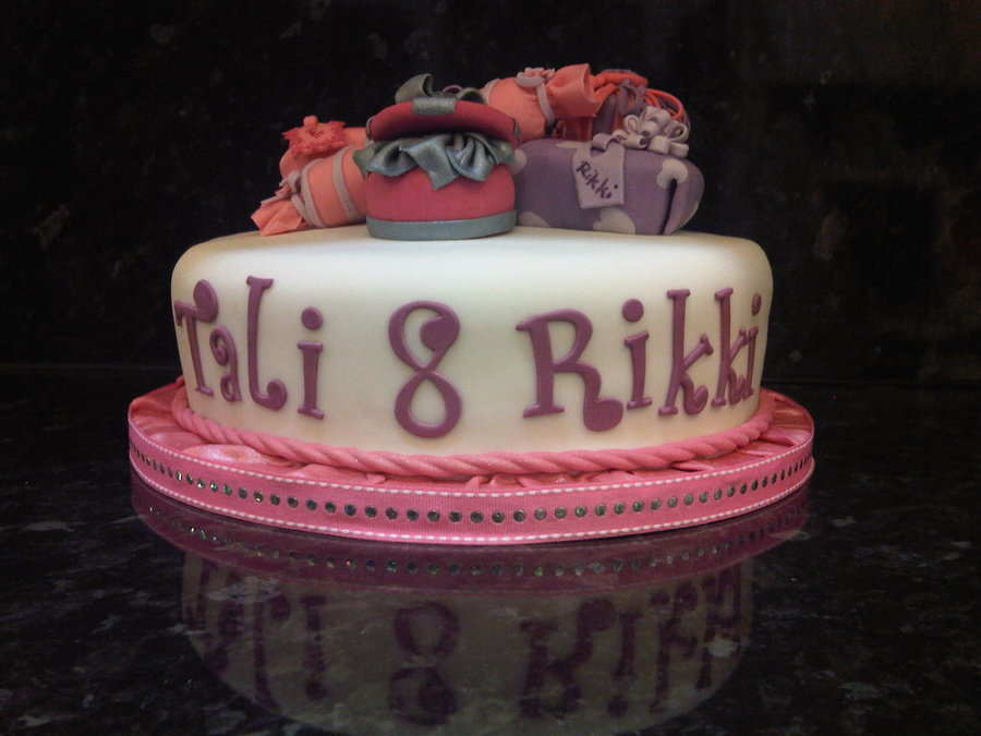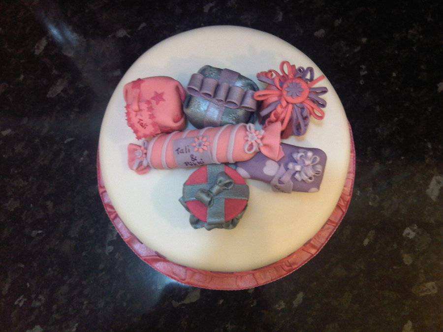 cake for twin 8yr girls who wanted a pile of gifts on their cake. gifts are marzipan covered with gum paste.