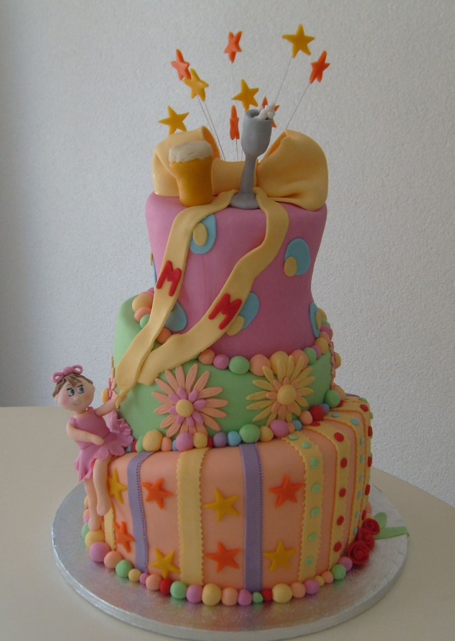 Wedding cake for a couple that had quite a lot of wishes: they wanted a different shape of wedding cake with a glass of beer and a glass of wine on top, a ribbon with their initials (M and M) and their 'daughter holding the ribbons. Oh, and I had to incorporate vivid colors. Thanks for watching!