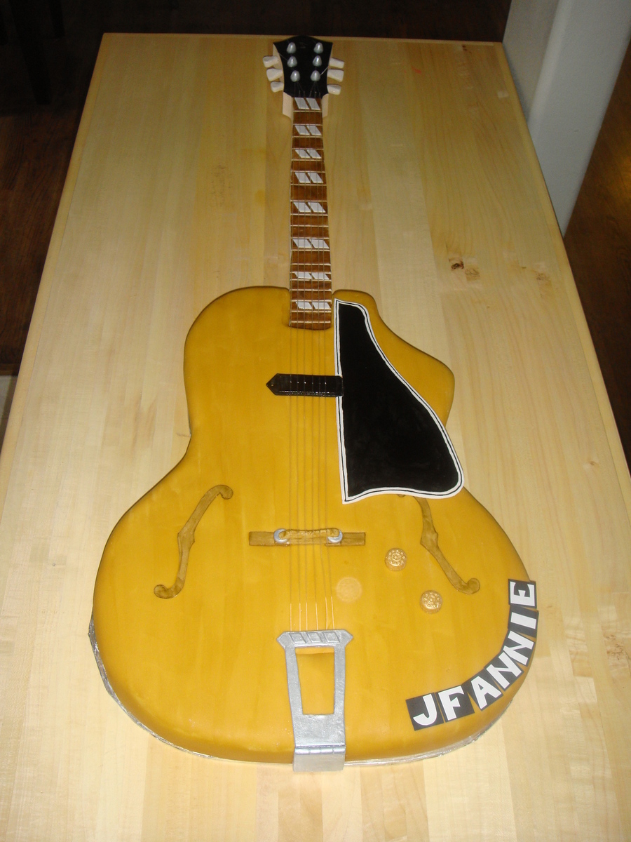 This was a replica of an guitar owned by a 80 year old. The strings were fishing line. The arm was wood covered in MMF. All accent pieces were gumpaste or fondant. TFL