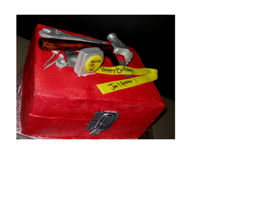 Simple toolbox shape covered in buttercream. Airbrushed red. Fondant accents/tools.
