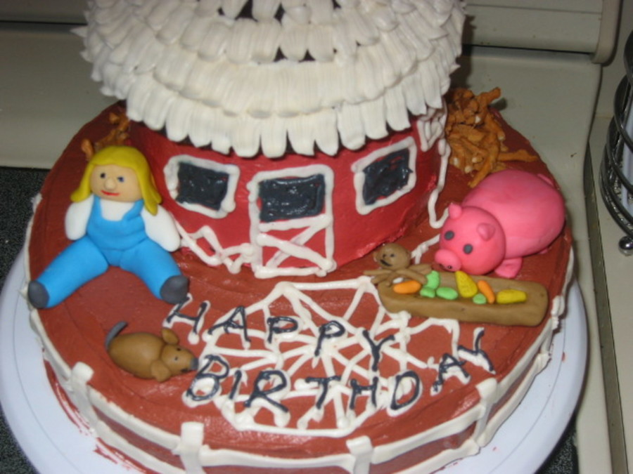 When my daughter requested a Charlotte's Web cake for her third birthday, this is what she got. The cake is chocolate, as is the icing on everything but the barn roof. The figures are made of fondant. I used the giant cupcake pan from Wilton for the barn.