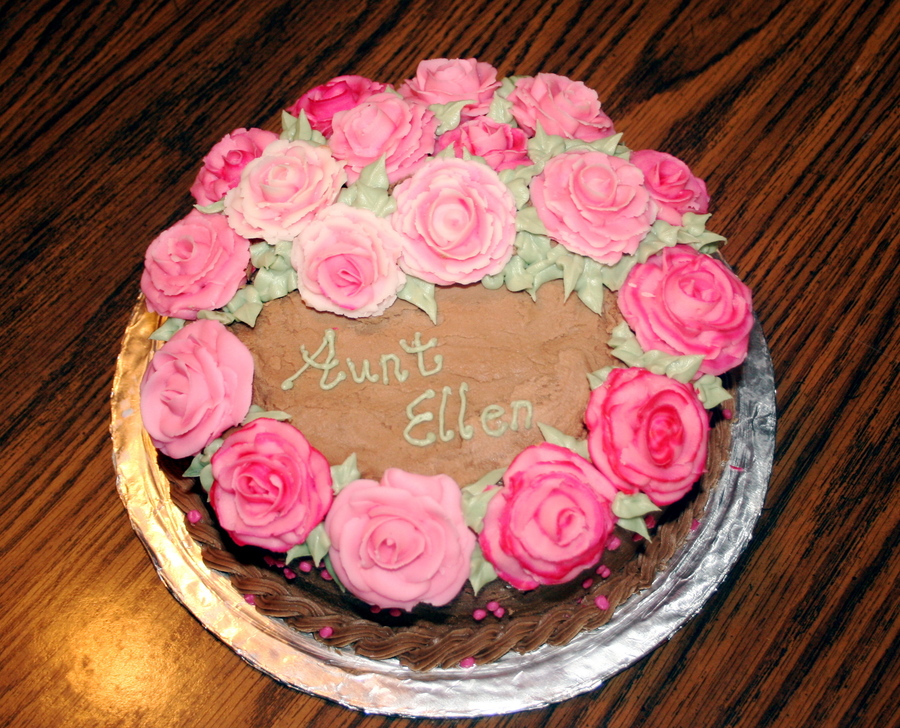A 8 inch cake covered in choc. buttercream. The rose colors were created with striping the pastry bag.
