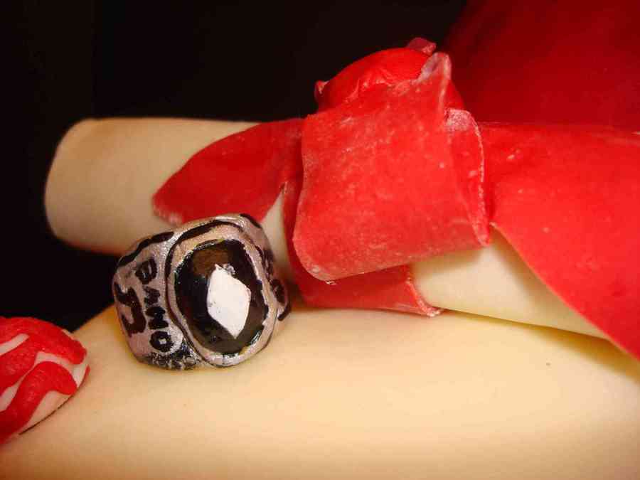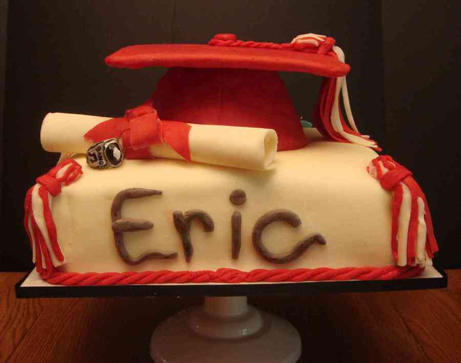 Graduation cap, diploma and class ring made from modeling chocolate. Cake is also covered in modeling chocolate.