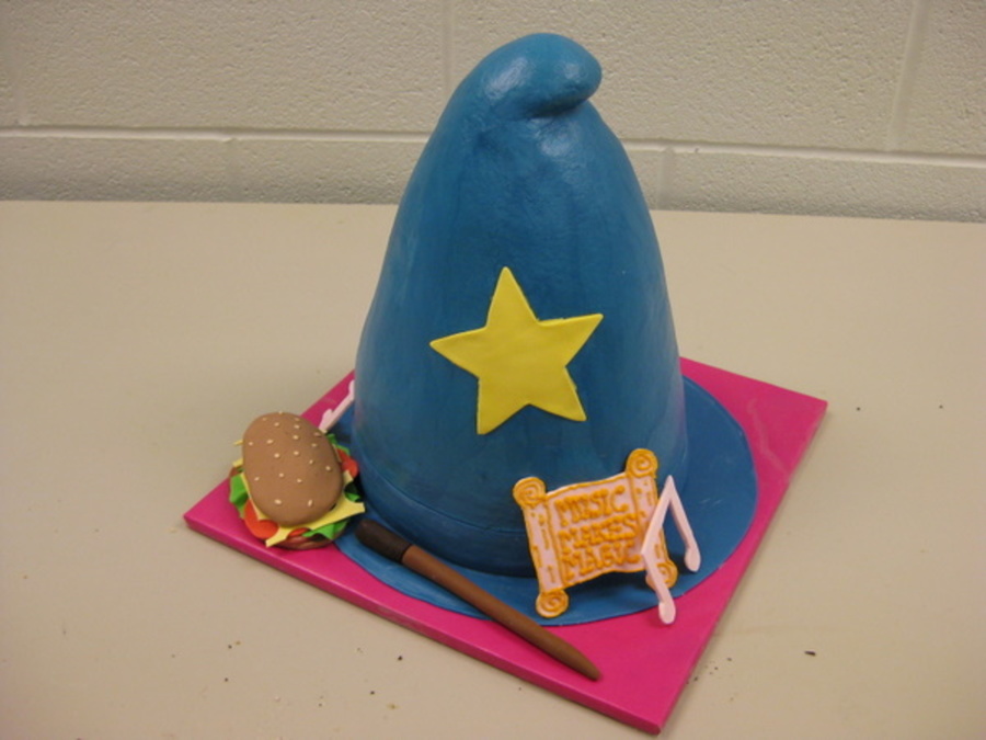 The little girl was very specific to what she wanted. Stacked 5 8 inch cakes and carved to look sort of like a hat. covered in BC and smoothed. Sandwich, wand, sign and notes are all fondant. Thanks for looking