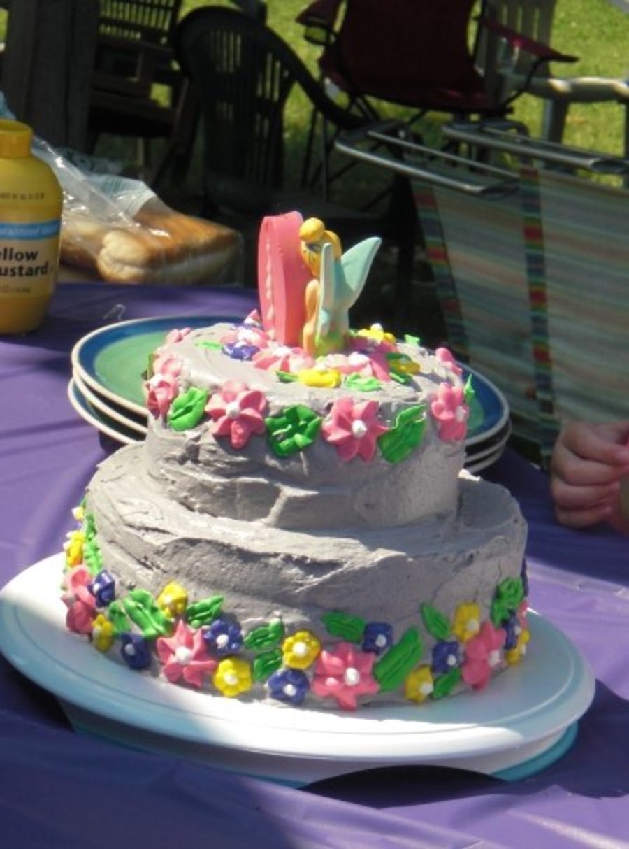 This was my first attempt at a tiered cake, decorated cake, you name it.. Didn't come out too bad. Chocolate cake with peanut butter buttercream icing. Used royal icing for the flowers. Not a great picture, but sadly the only one I have.