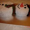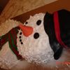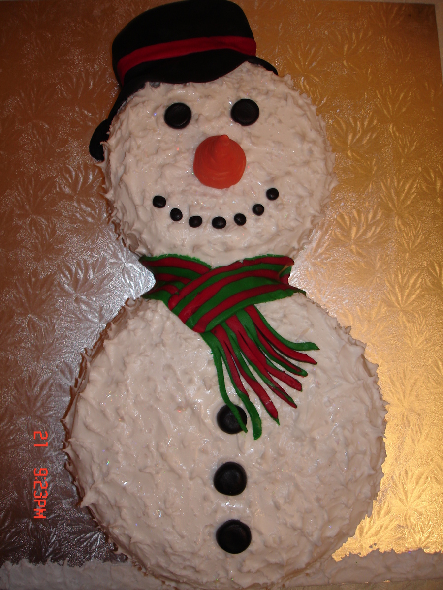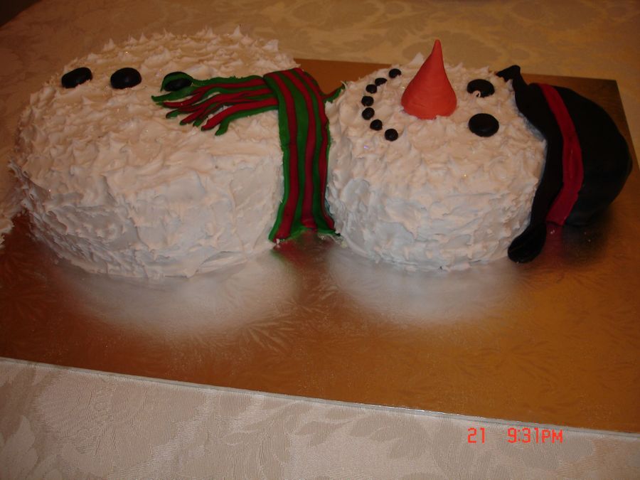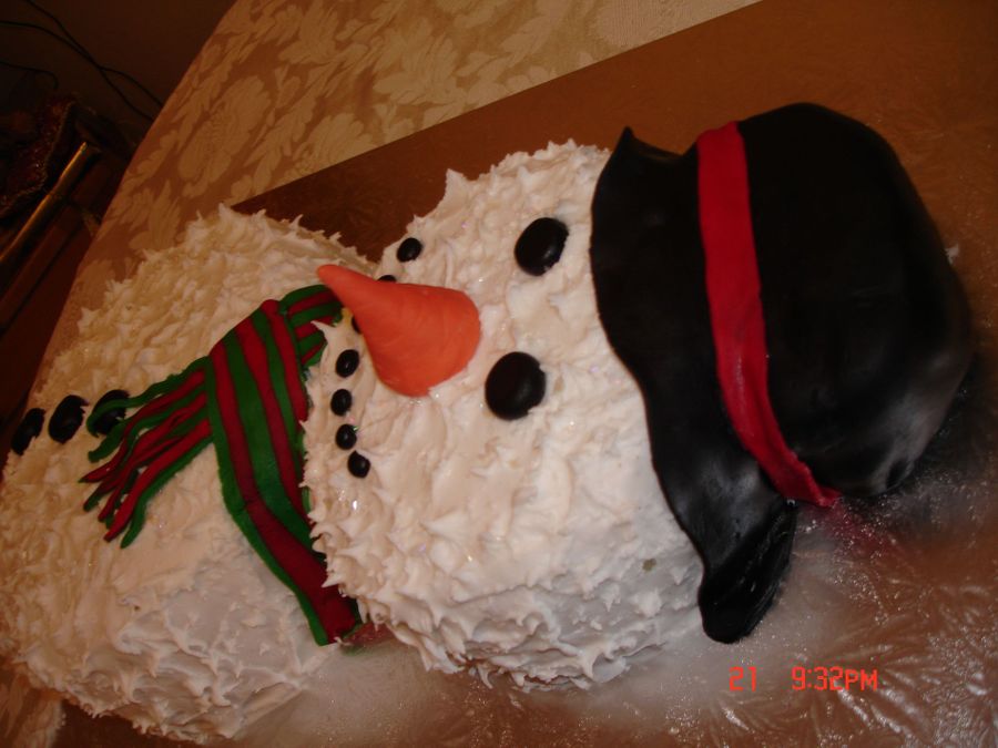 This was my first attempt at a snowman cake, he is covered in royal icing sprinkled with sparkles and has fondant features